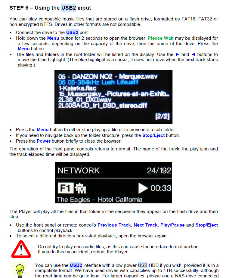 Using a thumb drive directly into the USB port is not a great user experience and is really there for limited use such as a friend bringing round a few tracks.Note the format requirement.