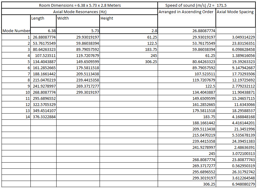 This is a simplified way of doing it and only accounts for axial modes (modes between two surfaces, and not tangential and oblique modes for four or six surfaces), but its a very good starting point for judging room dimensions to work out how plagued you will be by axial modal problems.